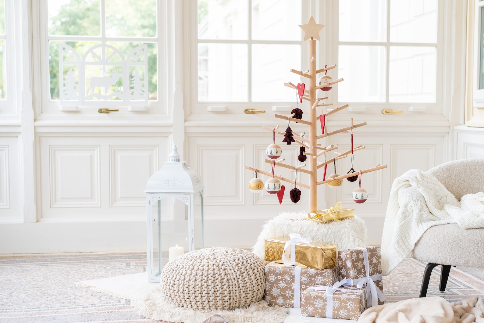 Dann haben wir den wuchtigen Baum mit hellem Goldschmuck von Jasmina Bylund in dem traumhaften grauen Raum. So perfekt, wie der Baum ist, könnte er glatt als Kunstbaum durchgehen. Ist er aber nicht! Der ist 100 % echt.